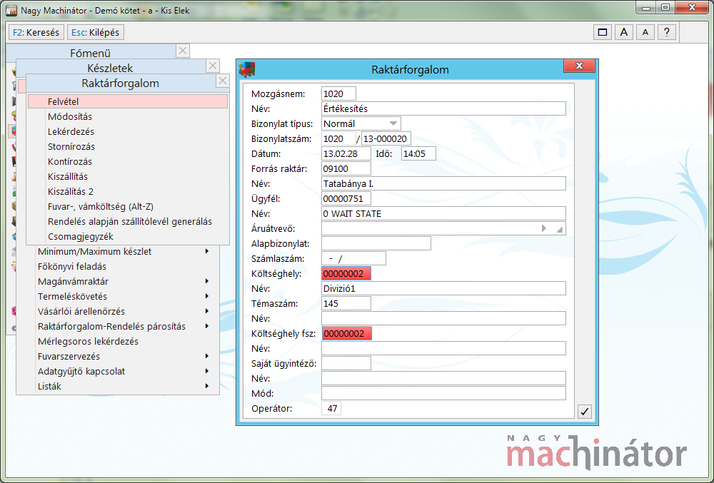 Költséghely főkönyvi szám mező értékébe nem ajánlj be semmit sem a program. |