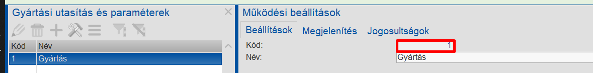 A paraméter értékébe a Gyártás (Rendelés alapú) funkcióban definiált működési paraméter azonosítóját (Kódját) kell írni.