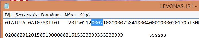 Két fájl készül. A MUNKABER.121-be csak a bérek kerülnek, míg készül egy LEVONAS.121 fájl is hasonló szerkezettel a levonásként számfejtett összegekről. A LEVONAS.121 fájlban a Közlemény rovatba nem a fix "Munkabér" szöveg kerül, hanem a levonásoknál beállított "Bírósági végzés" mező tartalma. Mivel ezzel a megoldással egy napon két fájl készül, ezért a második fájlba (LEVONAS.121) a fejlécbe a dátum értéke után található sorszám 0002 lesz, mivel van olyan banki program, amely nem enged azonos sorszámmal egy napra több fájlt beimportálni: |