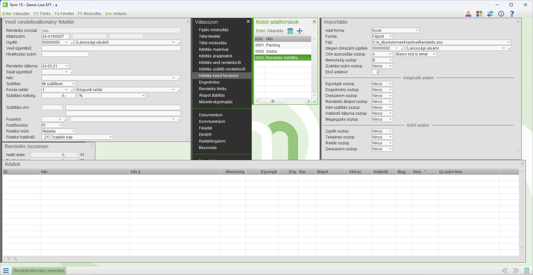 A rendelésgenerálás funkcióban az egyes Excel táblákat feldolgozzák.