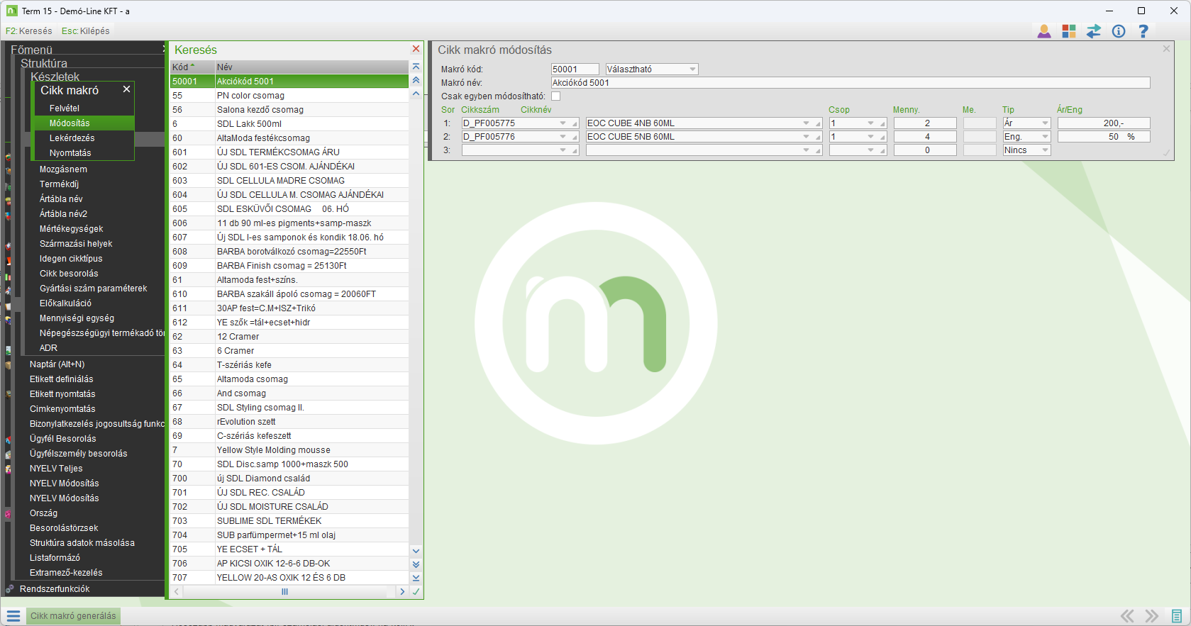 A kedvezmény csomagokat (Akciókódokat) a Makró bevitelben lehet rögzíteni.