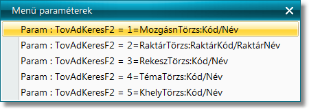 TovAdKeresF2 : <cimke sorszám>=<adatfájlnév>:<Kód mező neve>/<Név mező neve>.