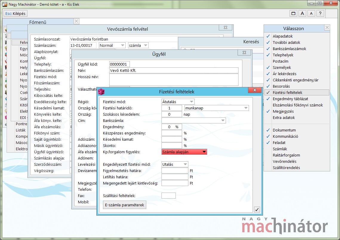 Van olyan ügyfelünk, aki szerint, ha egy vevő folyamatosan vásárol náluk és ezért kap is valamilyen állandó kedvezményt, esetleg még az árut is kiszállítjuk a részére, akkor ezek már mind-mind olyan egyedi feltételek, amit nevezhetünk szerződésnek, hiszen erről biztos, hogy valamiféle szóbeli megbeszélés / megállapodás történt, ami a Ptk. szerint szerződésnek minősül. Azaz, minden olyan számla, ami tartalmilag a hagyományostól eltér (kedvezmény, egyedi ár, kiszállítás, stb.) szerződéses számlának minősíthető. Ebből az érvelésből kiindulva az ügyféltörzsben, a fizetési feltételek ablakban beállítható, hogyan történjen a készpénz forgalom figyelés.