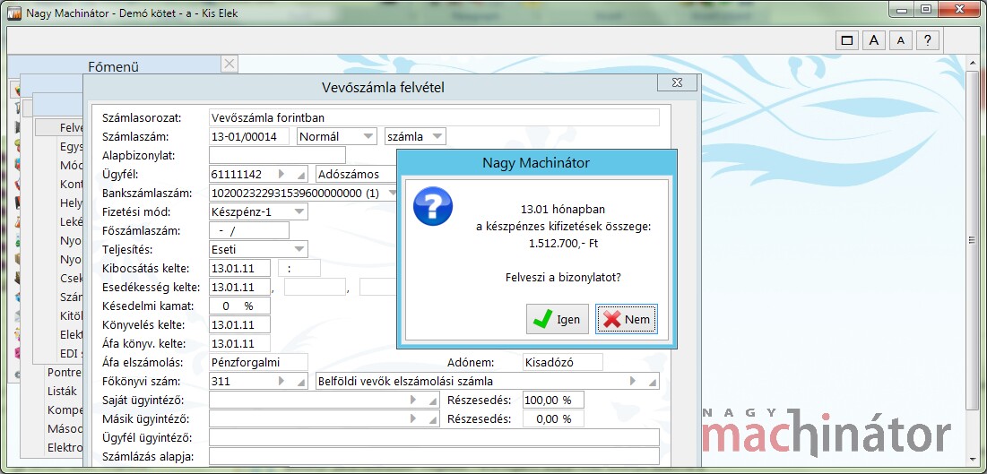 Amennyiben Készpénz1, Készpénz2 a fizetési mód és és nincs megadva az adószám, a program figyelmeztet, hogy az ügyfél adószámát meg kell adni.