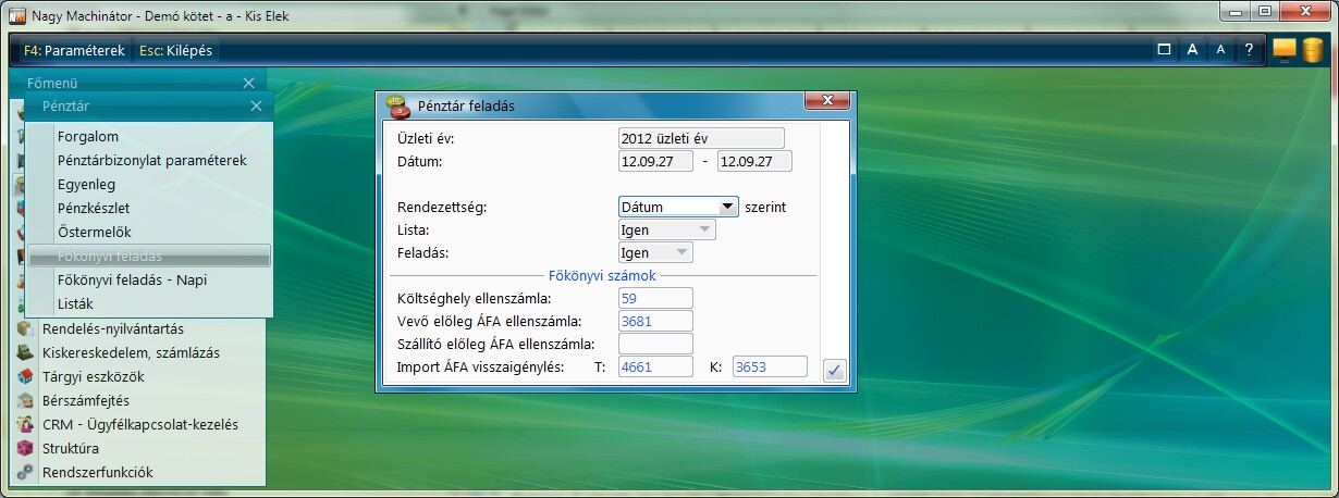 Dátum: A pénztártételek a pénztár bizonylat dátumával kerülnek a főkönyvbe.