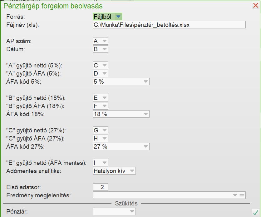 Ezt az Excel táblát lehet a programba betölteni. A beviteli ablakban megadható, hogy az egyes gyűjtők nettó és áfa értékei mely oszlopokban keresendők, ill. az adómentes értékek milyen áfaanalitával kerüljenek rögzítésre. A működéshez szükséges, hogy a Pénztártörzsben megadjuk az adott pénztárhoz tartozó pénztárgép AP számát. A program figyeli a SzigorúRend beállítását, a Módosítások letiltása beállítását, ill. az, hogy a pénztár használható-e, azonban nem figyeli azt, hogy egy napi adat be van-e már töltve.