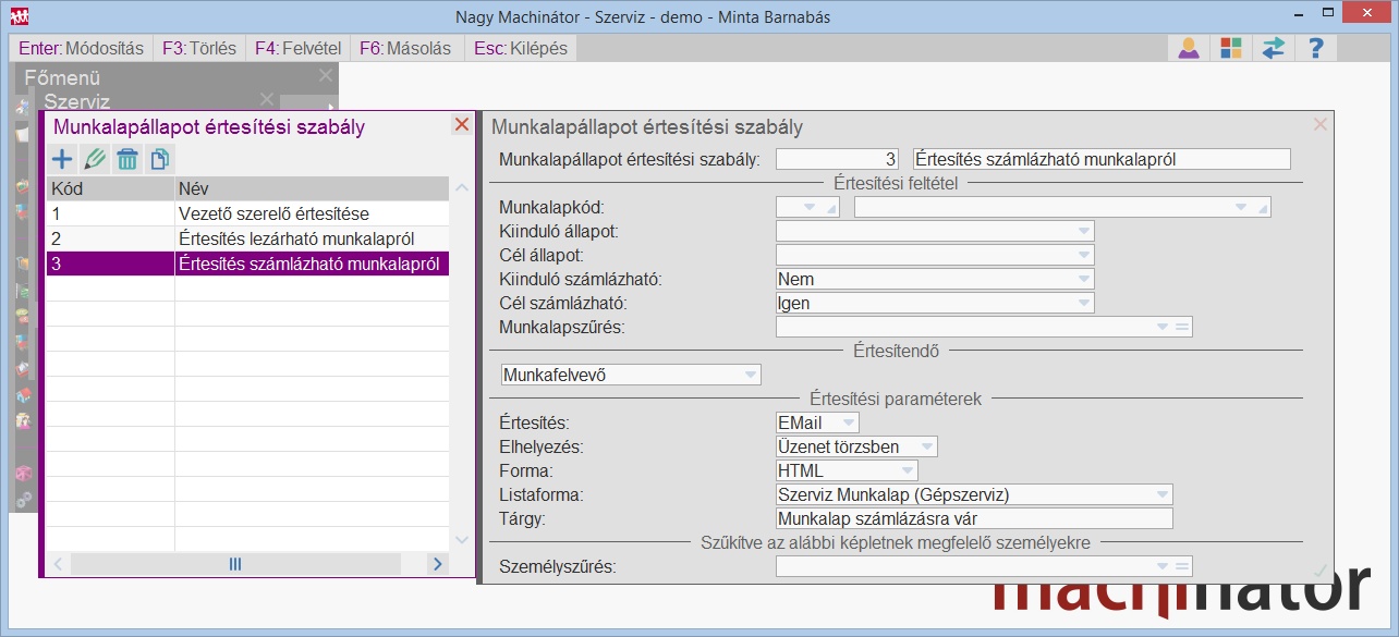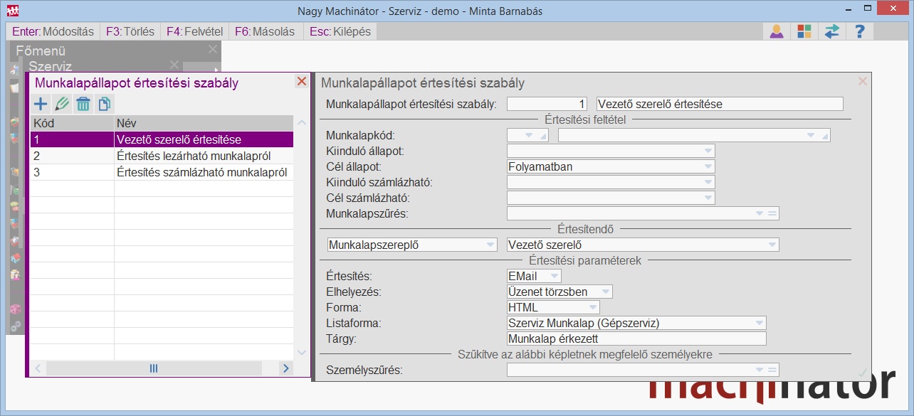 Miután az adminisztrátor rögzítette a munkához szükséges munkákat (műveleteket) és alapanyagokat, a program értesíti erről a szerelő(ke)t, az alábbi szabály alapján.