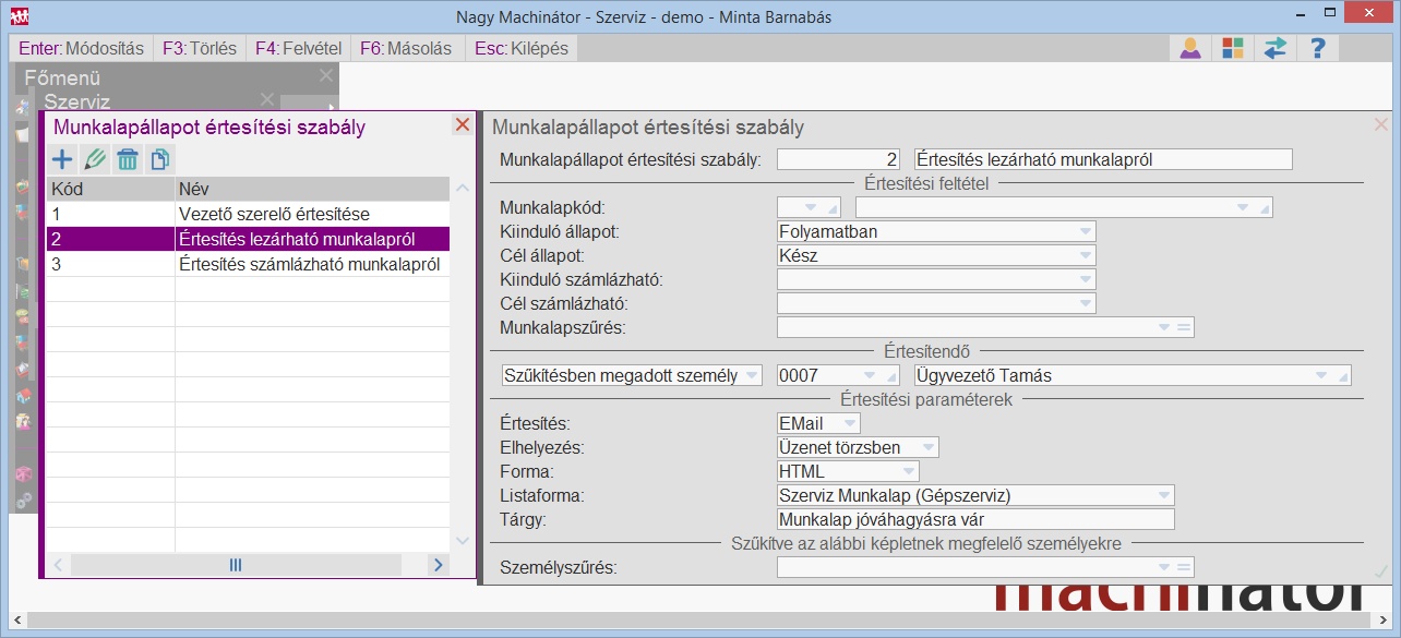 Az adminisztrátor készre jelenti a munkalapot, melyről a vezető értesítést kap, az alábbi szabály alapján.
