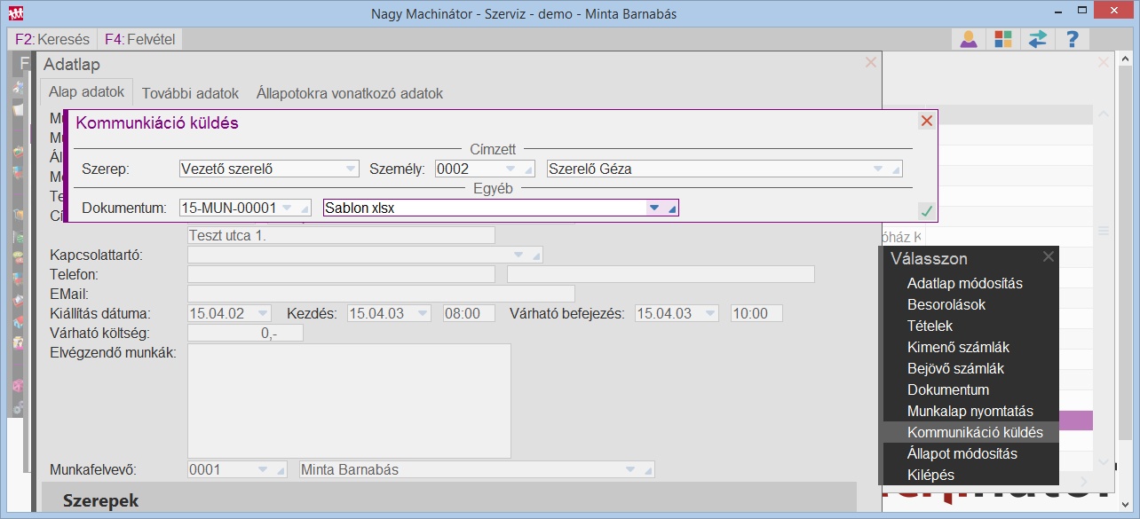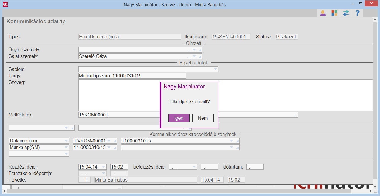 A kommunikációs adatlap automatikus feltöltését követően az adminisztrátor elküldi az e-mailt a szerelőnek. (A személy törzsben megadott e-mail címre)
