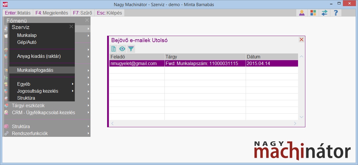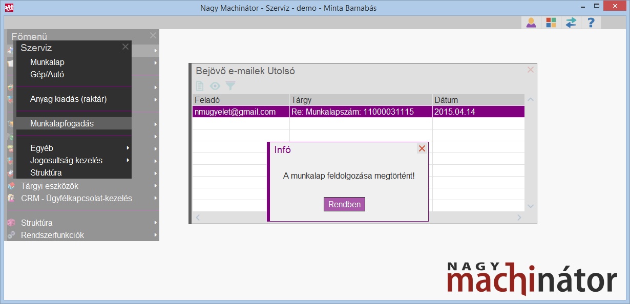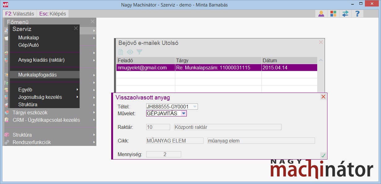 Az adminisztrátornak lehetősége van e-mail üzenetből történő munkalap (Excel) feldolgozásra. További információ -> Kommunikáció fogadás (Excel munkalap feldolgozás)