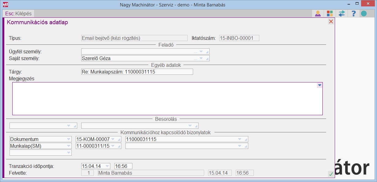 A folyamat végén az adminisztrátor a kommunikációs adatlap segítségével iktatja a szerelőtől érkező e-mailt.