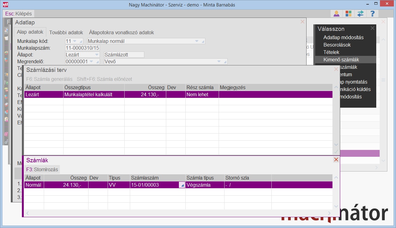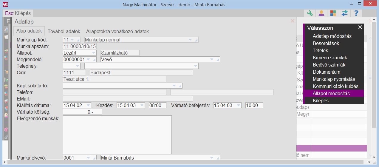 A munkalap állapota Folyamatban értékre vissza áll és lehet módosítani a munkalapot és állapot módosítás után újra lehet számlázni.