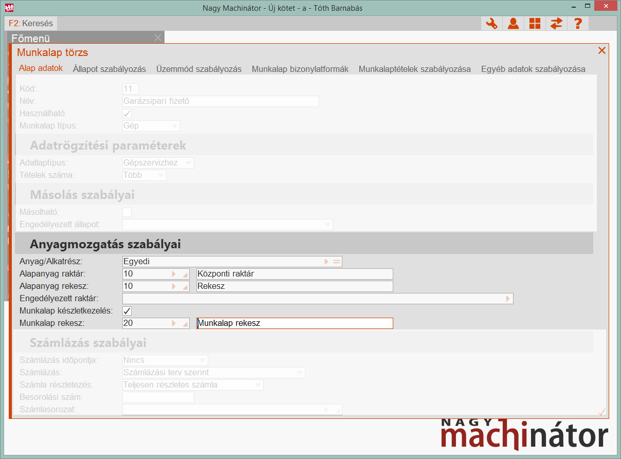 7, Munkalaptörzsben, a Anyagmozgatás részben kell beállítani a Munkalap készletkezelést .
