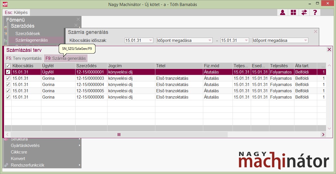 Az F9:Számlagenerálás funkció megnyomása után a kipipált sorok lesznek kiszámlázva.