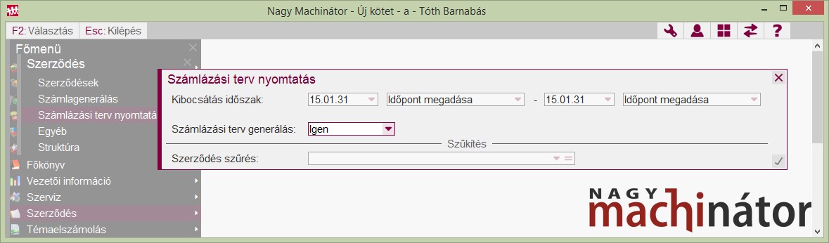 A számlázási terv nyomtatás menüpontban lehet listázni azokat a számlákat, amelyeket ki kell számlázni egy adott időszakban.