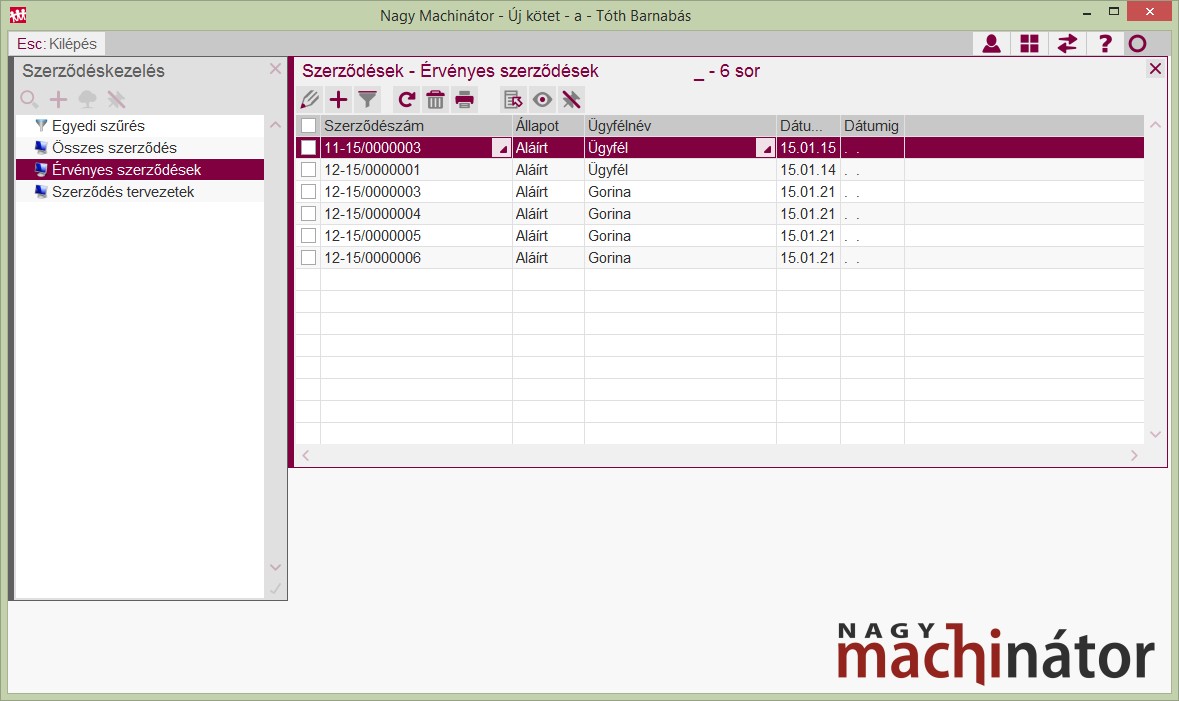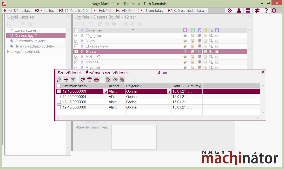 Az alábbi képen az látható, hogy az ügyfélszűrésből egyből el lett indítva a szerződés szűrés és láthatók az adott ügyfélre vonatkozó szerződések. Ezzel kapcsolatban lásd Szűrésváltozatok egymásba ágyazására