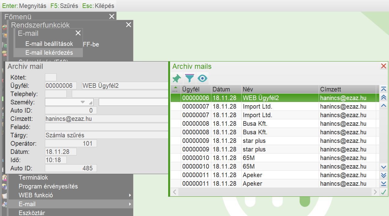Szűrés (F5) Az eredményablak adatai szűrhetők időszakra, ügyfélre és címzett szövegrészre. |