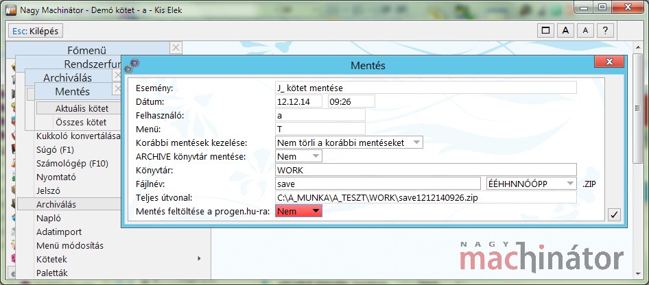 A mentés csak a kiszolgáló gépen végezhető, és csak akkor, ha az összes munkaállomás kilépett. Ajánlatos a hét minden napján más lemezre menteni, valamint havonta egy mentést eltenni, és más épületben őrizni.