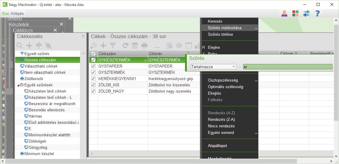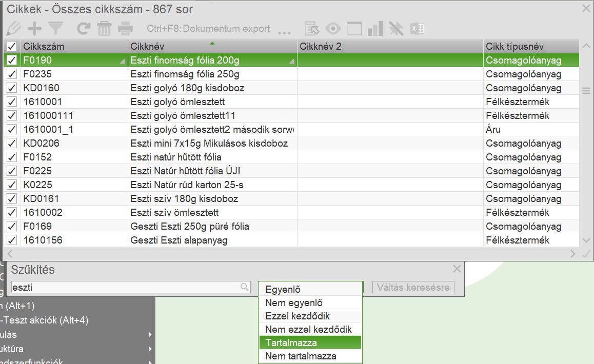 A program a GridParam állományban akciónként elmenti, hogy milyen jellegű keresést/szűkítést használtunk legutóbb (tartalmazza/egyenlő/ezzel kezdődik...) és azt ajánlja fel az adott akció újabb használatánál.