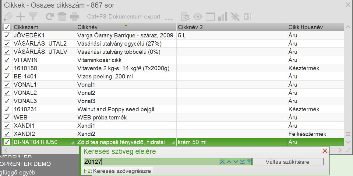 Keresés üzemmódban csak az indexelt oszlop szerint történik keresés. A keresés vagy szöveg részre vagy szöveg elejére történik F2 gomb).