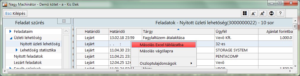 A grid tartalmát egy mozdulattal lehet excel táblázatba (vagy vágólapra) tenni. Ehhez a griden bárhol egér jobb gombbal kattintunk (vagy megnyomjuk a billentyűzeten a helyi menü gombot