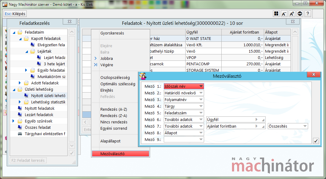 Abban az esetben, ha a gridben valamilyen adatra van szükség, de nem látható a képen, akkor az ún. Mezőválasztás segítségével bővíthetjük azoknak az adatoknak a körét, amellyel a funkció feltölti a gridet.