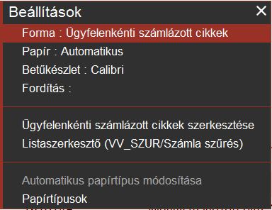 Az adott listaformánál elérhető papírtípusok választása. Hatása egyenértékű a nyomtatási képen az aktuális papírtípus nevét mutató gombra kattintással. |