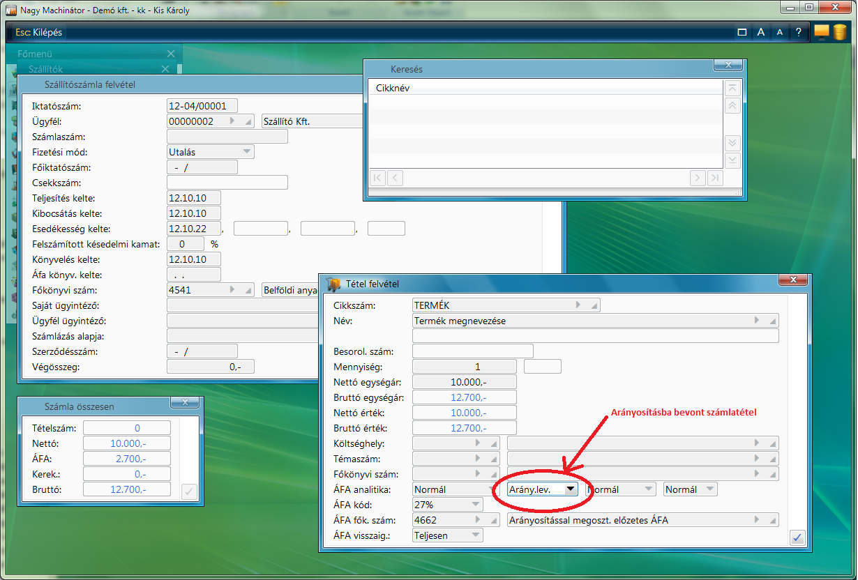 Az egyes analitikákhoz tartozó paraméterekben (Pl.: Szállítószámla paraméterek) érdemes az Arányosítás Áfa főkönyvi számot előre beparaméterezni!