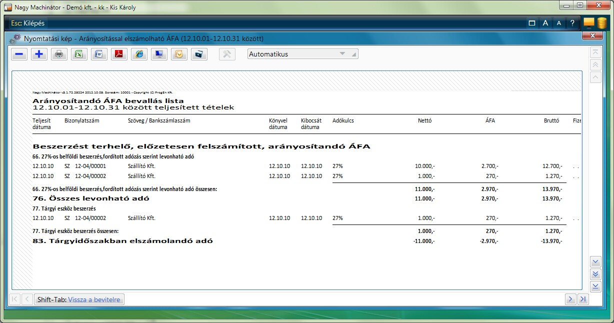Az áfabevallás nem ezzel a listával történik! Ez a lista csak arra való, hogy megállapítsuk az Arányosítással elszámolandó áfa összegét.