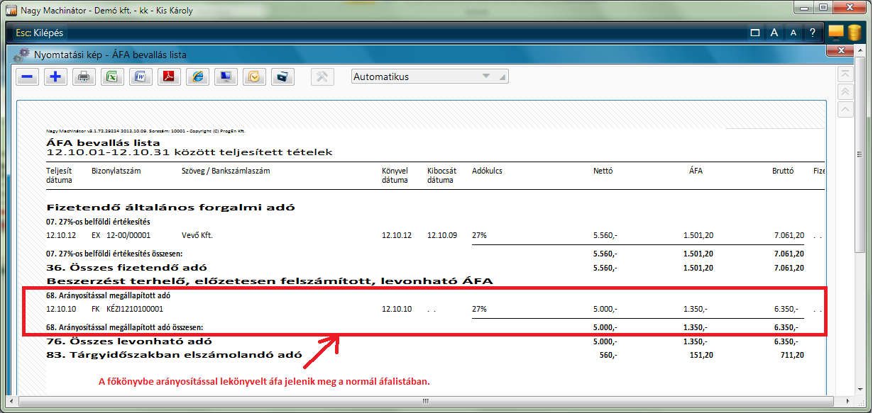 Az arányosításba bevont számlák egy külön áfa elszámolásban, az un. Áfa bevalláslista (arányosítással)-ban szerepelnek.