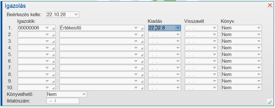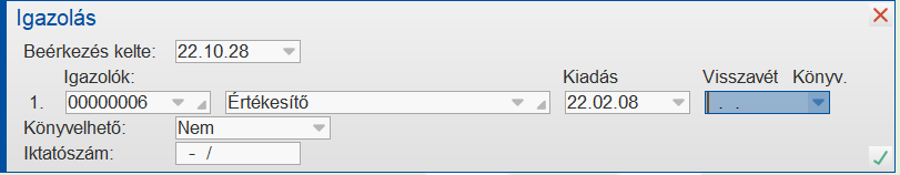 Az igazolás párbeszédablak alján található a Főigazoláshoz tartozó Könyvelhető mező.