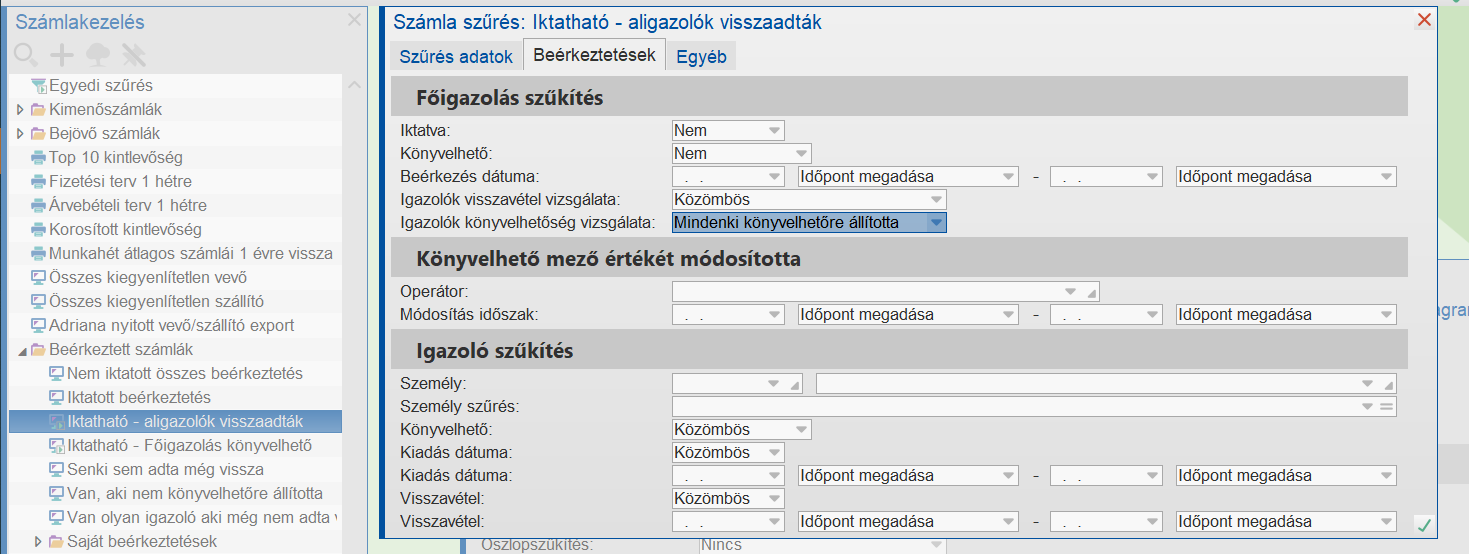 A lekérdezéseket a számlakezelés funkcióban a Beérkeztetés fül szűrési feltételinek segítségével lehet összeállítani.