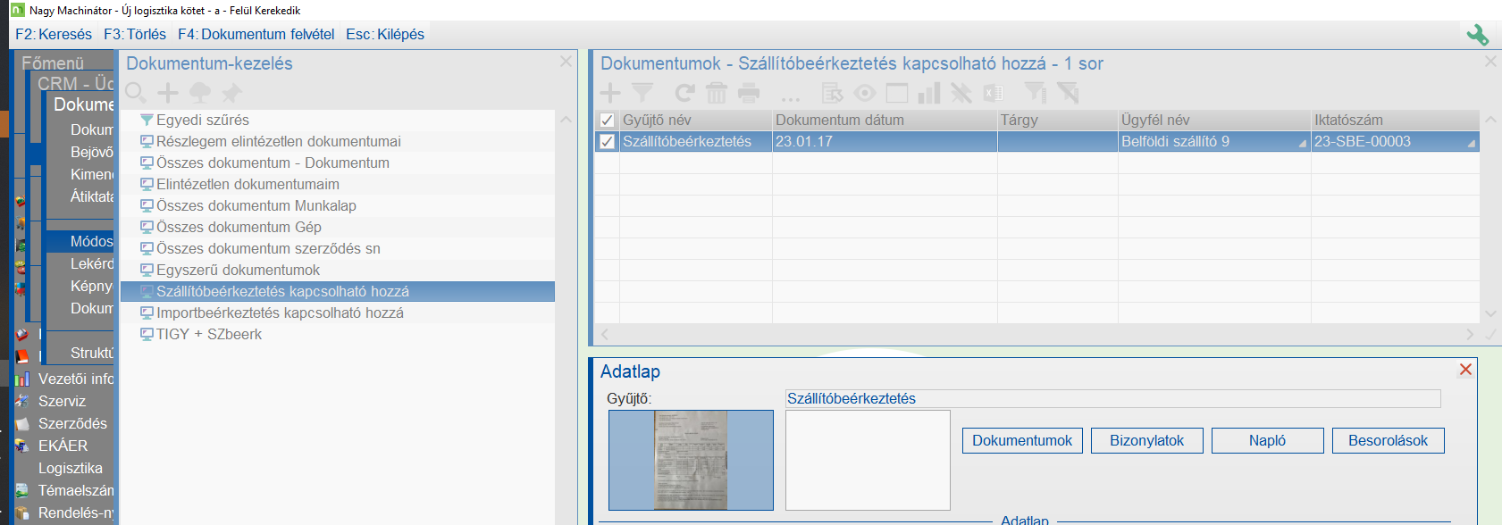 A dokumentum almenüpont elindítása után megjelennek azok a dokumentumok, amelyek a beérkeztetett számlához lett kapcsolva.