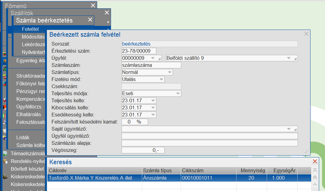 A számla-beérkeztetés bizonylatban tételesen rögzítésre kerülnek a kapott számla adatai, viszont a szállító folyószámlán még nem jelennek meg.