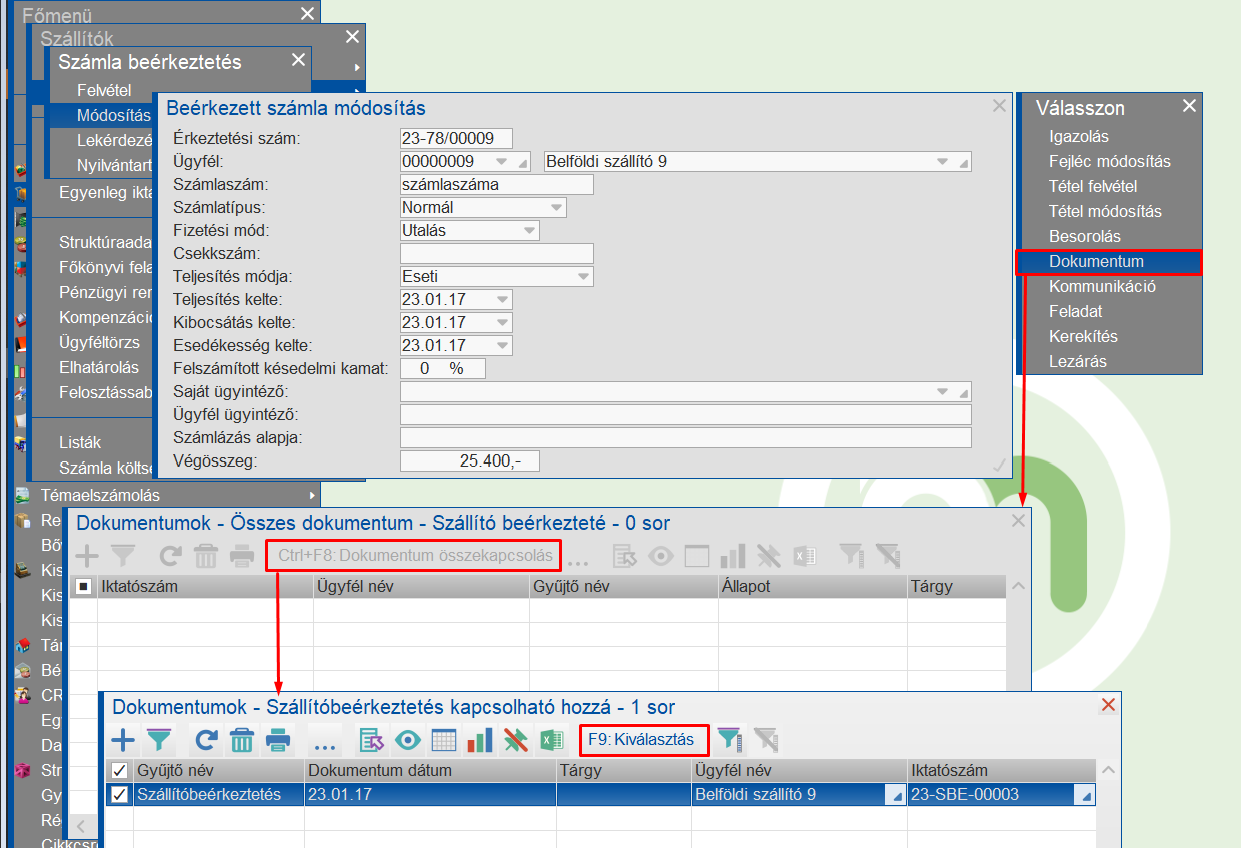 Ebben az esettanulmányban viszont már valaki korábban iktatta a dokumentumot, ezért a Dokumentum összekapcsolás műveletet kell elindítani, amely megkeresi azokat a dokumentumokat, amelyek