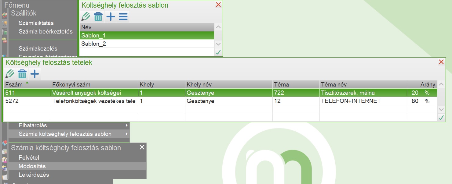 A funkcióval létrehozhatók felosztási sablonok, melyeket a Szállító, Import és Pénztár modulokban lehet a tétel felvételben használni.