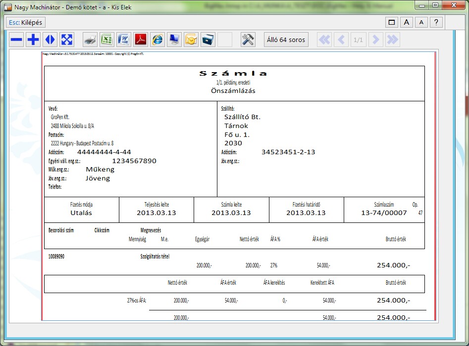 A számlarögzítés után a Nyomtatás, lezárás menüpont választását követően a program számlát nyomtat, amely megfelel a számla adattartalmára vonatkozó elvárásoknak.