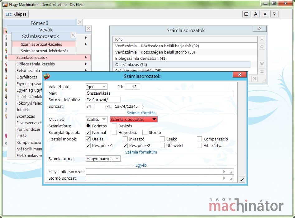 Ahhoz hogy Önszámlát ki tudjunk állítani a Számlasorozatok funkcióban a képen látható Művelet beállítással rögzíteni kell egy számlasorozatot.