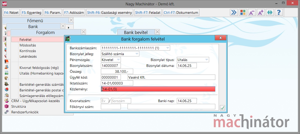 Banktétel: T 384 - K 454 ( A banktétel generálás automatikusan átveszi a számla fejlécben megadott főkönyvi számot)
