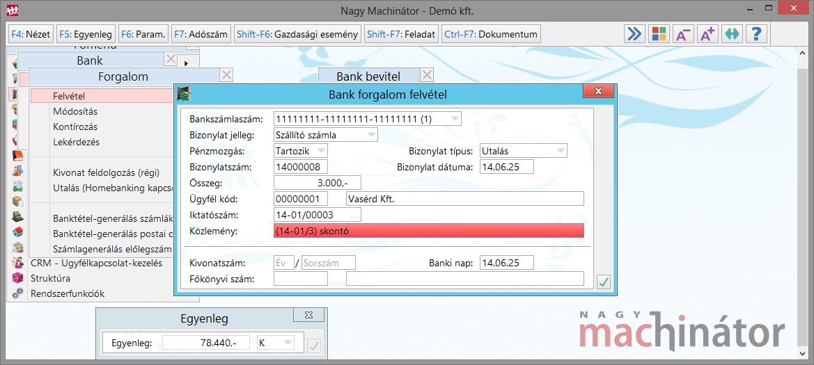 A törvény értelmében a számla teljes összegét ki kell egyenlíteni, abból nem vonható le a skontó. Ezért a programban is először teljes összeggel fel kell rögzíteni bankba vagy pénztárba a számla kiegyenlítését, majd a skontó beérkezését követően egy újabb tételben a skontó összegét.