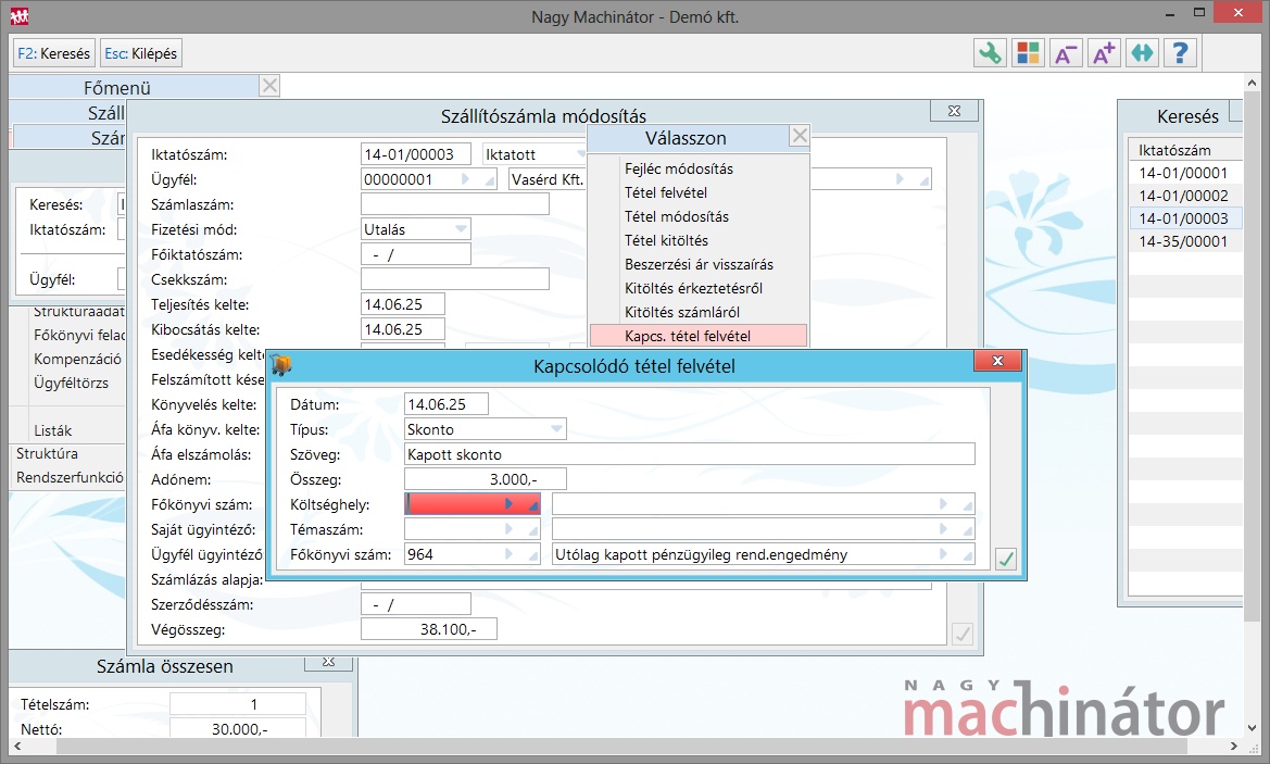 Miután beérkezett a szállítótól a skontó összege, fel kell rögzíteni kapcsolódó tételként az érintett számlához az összeget.
