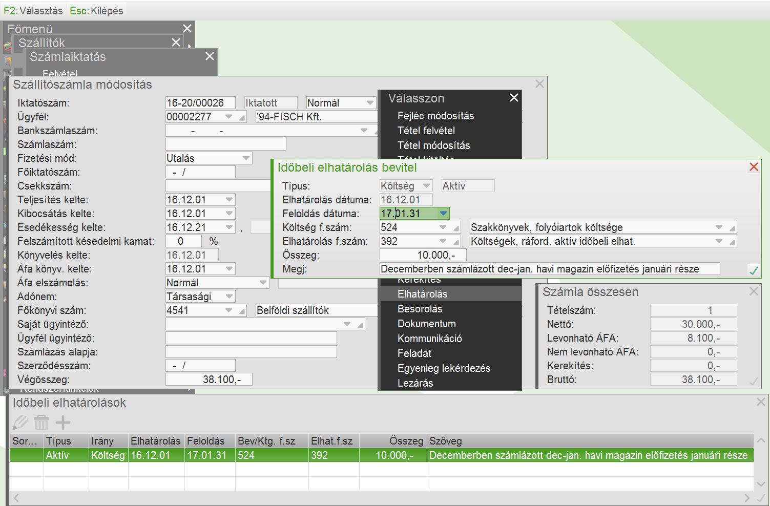 A funkcióval főkönyvi elhatárolás készíthető a számla tételeire vonatkozóan. Az elhatárolást felvehetjük manuálisan vagy generáltathatjuk a programmal.