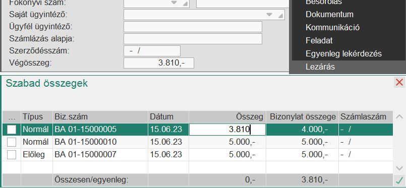 Lezáráskor lehetőségünk van olyan banki vagy pénztári fizetéseket a számlához kapcsolni, melyek szállító, ill, szállító előleg jellegűek, irányuk megfelel a számlának (azaz pozitív szállító számla esetében csak "Követel" /Bank/ vagy "Kiadás" /Pénztár/ irányú tételek jelennek meg), az adott ügyfélhez tartoznak és a számlaszám mezőjük üres, azaz szabad fizetésnek minősülnek. A megjeleníthető fizetések köre a számlasorozatokban befolyásolható.
