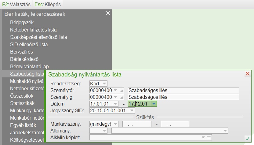 Navigáció: Bérszámfejtés > Listák, lekérdezések