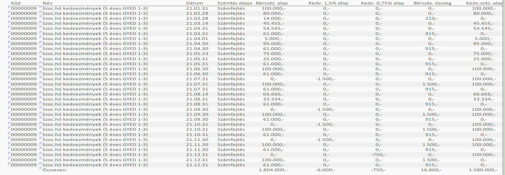 A Kedv.száz alap oszlop mutatja a szakképzési hozzájárulás alapját csökkentő kedvezmények összegét - nem kerül külön átadásra, a 30. sort csökkentő összeg az első félévben