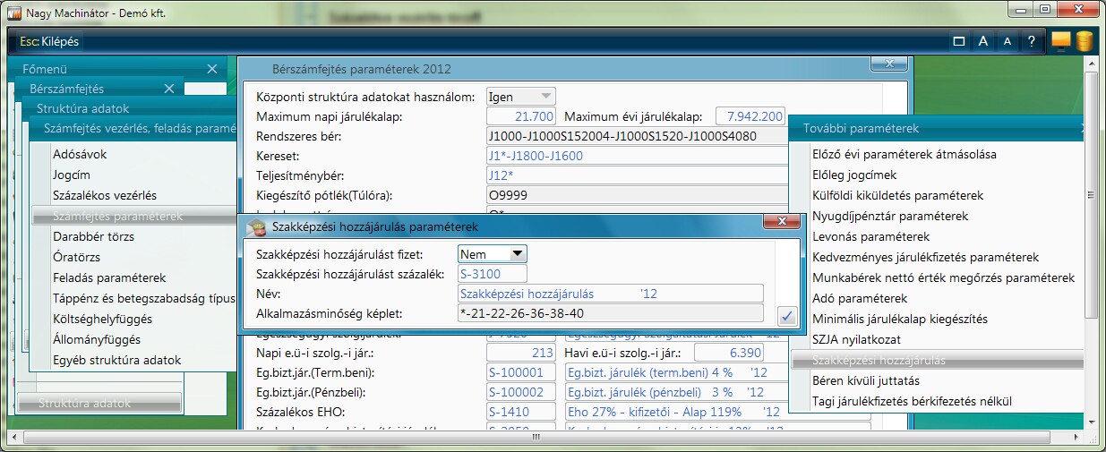 A Számfejtési paraméterek / Szakképzési hozzájárulás paraméterekben tudja a felhasználó a saját véleményének megfelelő értéket beállítani.
