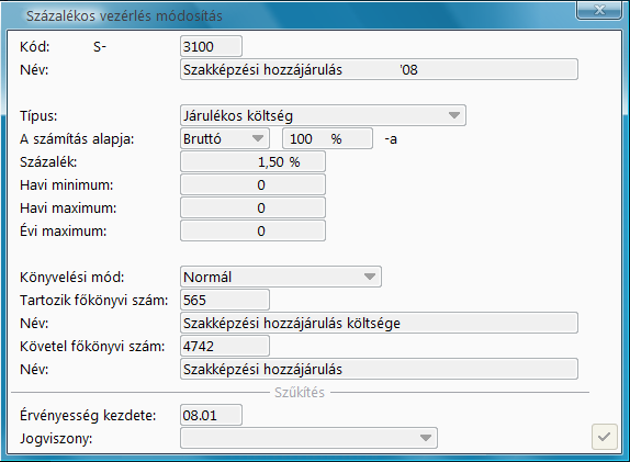Azokba a jogcímekbe, amelyek után a szakképzési hozzájárulást fizetni kell, fel kell venni a szakképzési hozzájárulás százalékos vezérlést.