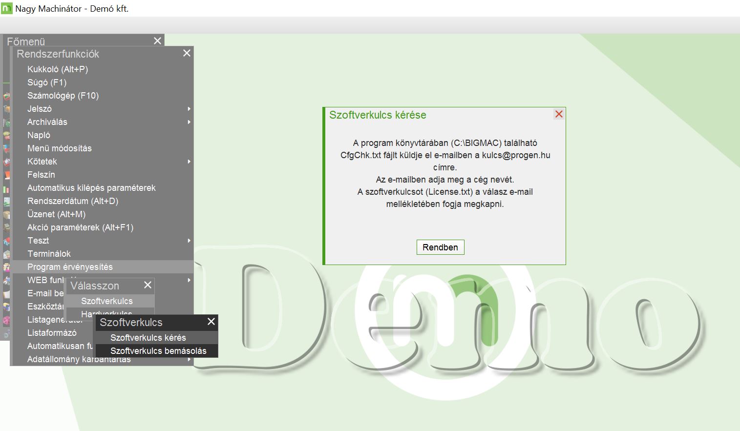 Szoftverkulcs esetén a Rendszerfunkciók/Program érvényesítés/Szoftverkulcs kérés akcióval készíthetünk egy fájlt, amely leírja az aktuális hardver és szoftver környezetet, majd ezt a fájlt el kell küldenünk a megadott email címre (kiegészítve a programot birtokló cég nevével és némi információval arra vonatkozóan, miért kérünk szoftverkulcs cserét).