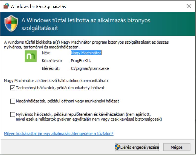 Természetesen gondoskodni kell arról, hogy a terminálok lássák az új gépen elindított Machinátor szerver magot. Amennyiben van tűzfal a gépen, a program első elindulásakor valószínűleg meg fogja kérdezni a Windows, hogy át akarjuk-e engedni a tűzfalon. Ezt mindenképpen engedélyeznünk kell.