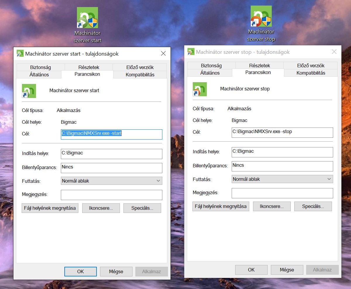 A szolgáltatásként futó Machinátor alaphelyzetben a Windows szolgáltatásjegyzékét tartalmazó ablakban indítható el, ill. állítható le, de ezt megkönnyíthetjük, ha kiteszünk két ikont az asztalra. (A szolgáltatás automatikus indítással települ, de ez csak a Windows következő elindulásával aktivizálódik!)